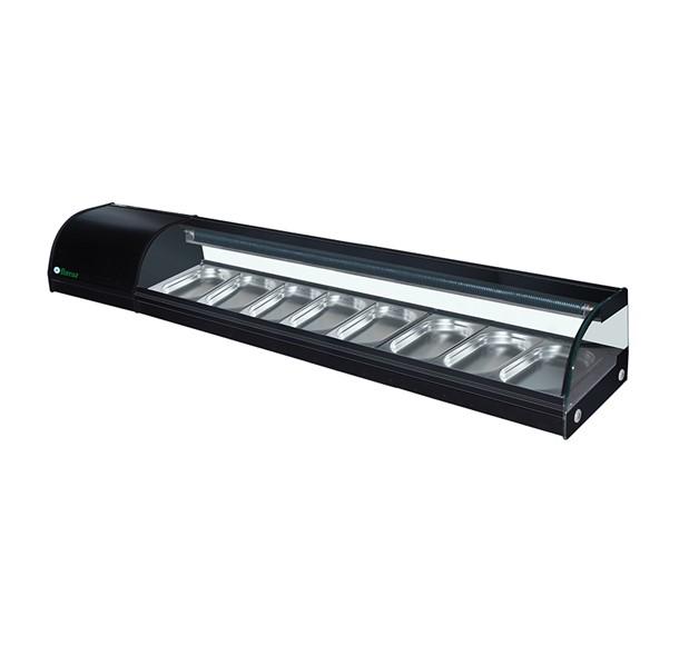 Tämä tyylikäs tapas- ja sushivitriini on suunniteltu erityisesti kylmien annosten, kuten sushin, tapasten ja muiden valmiiden ruoka-annosten houkuttelevaan esillepanoon. Laite on varustettu kahdeksalla GN 1/3-astialle tarkoitetulla paikalla ja kirkkaalla lasilla, joka takaa hyvän näkyvyyden sekä suojaa tuotteita
